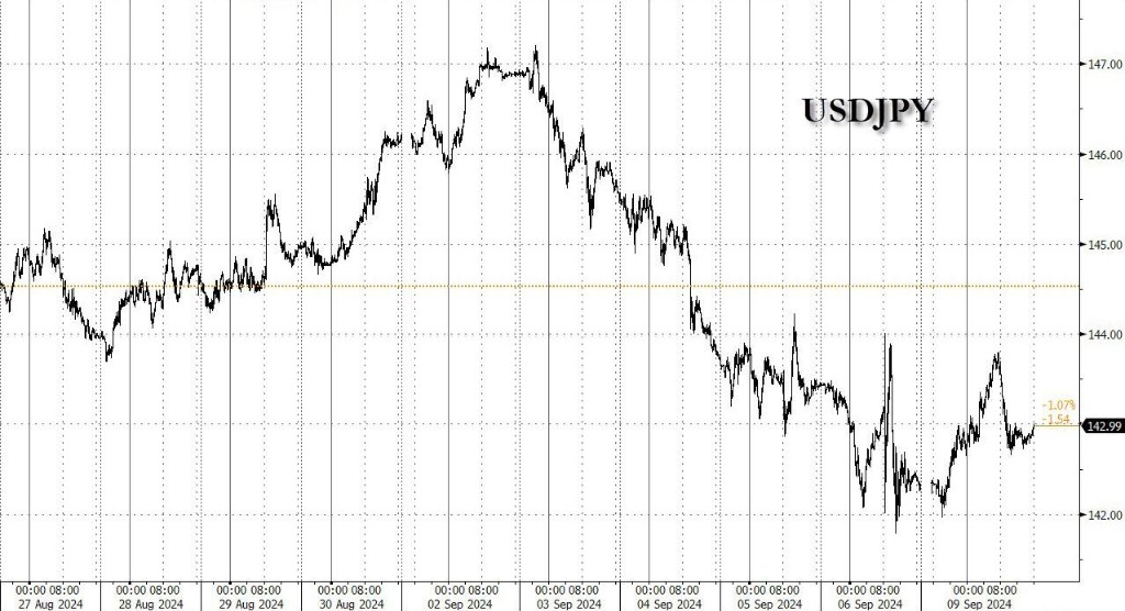 美聯儲大幅降息預期回撤,美元指數漲超0.4%延續非農日低位反彈的表現,日元兑美元盤中一度跌逾1%跌向144,日元止步四日連漲脱離年內高位,離岸人民幣一度跌 300點,市場預計週四歐洲央行降息 25個基點,歐元三週最低: