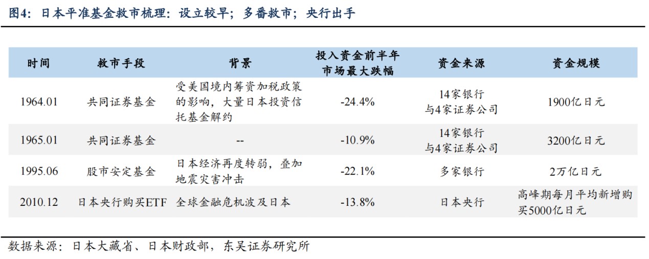 據東吳證券,日本分別在 1964 年、1965 年、1995 年和 2010 年四次股市下行時採用平準基金提振市場,在最近一次的 2010 年,日本政府直接採取了央行通過信託下場購買 ETF、股票的方式救市,當年規模達 1 萬億日元。