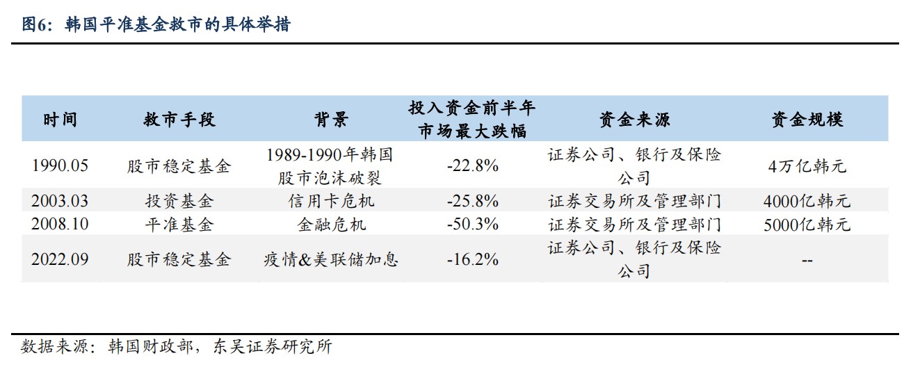 韓國平準基金設立後也多次抑制股市的劇烈下跌,前後亦有四次救市動作,分別在 1989-1990 年、2003 年、2008 年和 2022 年,其中在 1990 年韓國股市泡沫破裂時,韓國政府組織券商、保險、銀行等部門合計出資 4 萬億韓元救市。