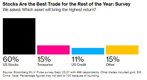 智通財經 APP 獲悉,彭博市場實時脈搏(MLIV Pulse)最新調查顯示,隨着美聯儲持續降息,多數受訪者預測美國股市在今年剩餘時間內的表現將超越政府及企業債券市場。具體而言,60% 的受訪者看好美國股市第四季度表現,59% 的投資者偏好新興市場而非發達市場,並避開傳統避險資產如美國國債、美元和黃金。