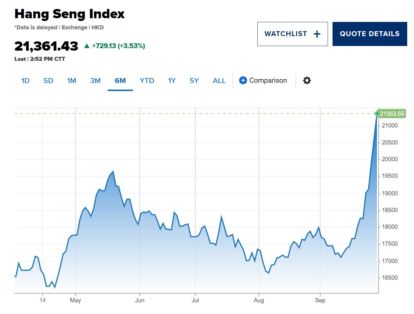 日經指數週一下跌的同時,中國股市也在飆升。上週五,中國內地滬深 300 指數創下 2008 年以來最大單週漲幅,香港恒生指數創下 1998 年以來最大單週漲幅。