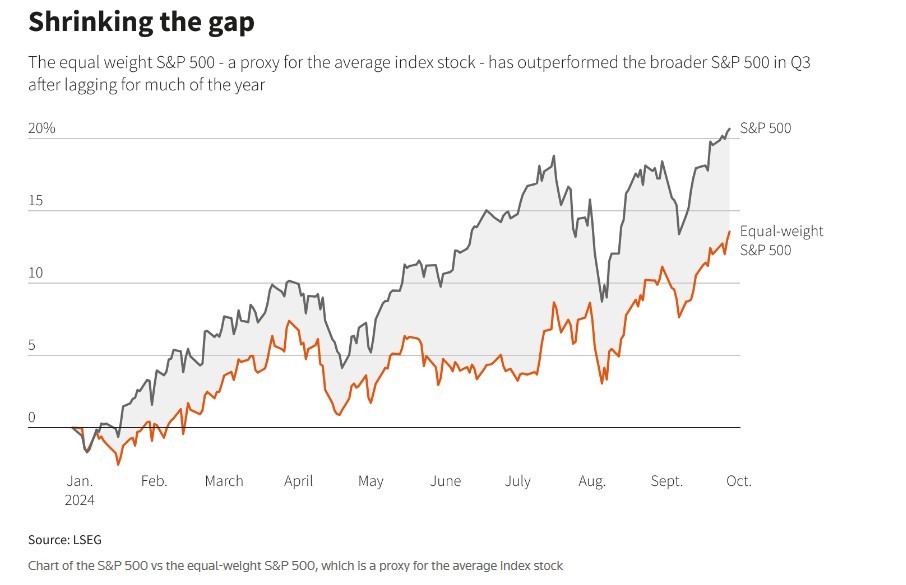 美國股市漲勢明顯擴大,越來越多個股跟隨標普 500 指數創紀錄漲幅,緩解了對大型科技股集中漲勢的擔憂。隨着 GDP 增速上修、失業金人數符合預期及通脹下行,市場對美國經濟 “軟着陸” 的樂觀情緒增強,預計標普 500 指數有望在年前觸及 6000 點。超過 60% 的標普 500 成分股表現優於該指數,等權重標普 500 指數漲幅高達 9%,顯示出市場對經濟復甦的信心。