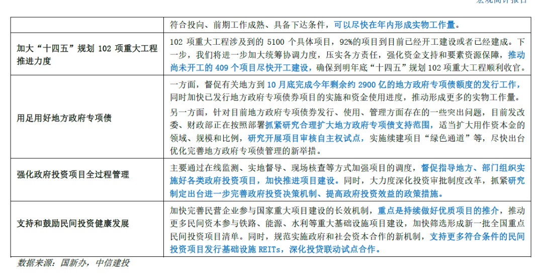 推進 102 項重大工程、用好專項債等是存量政策繼續推進。