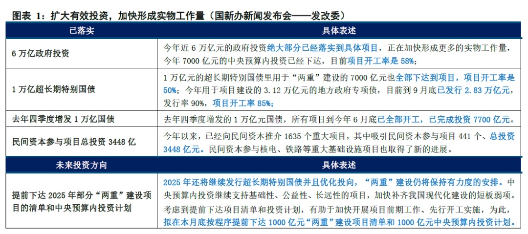 “提前下達 1000 億元 ‘兩重’ 建設項目清單和 1000 億元中央預算內投資計劃”,成熟的可以儘快在年內形成實物工作量,是增量政策的細節信息。