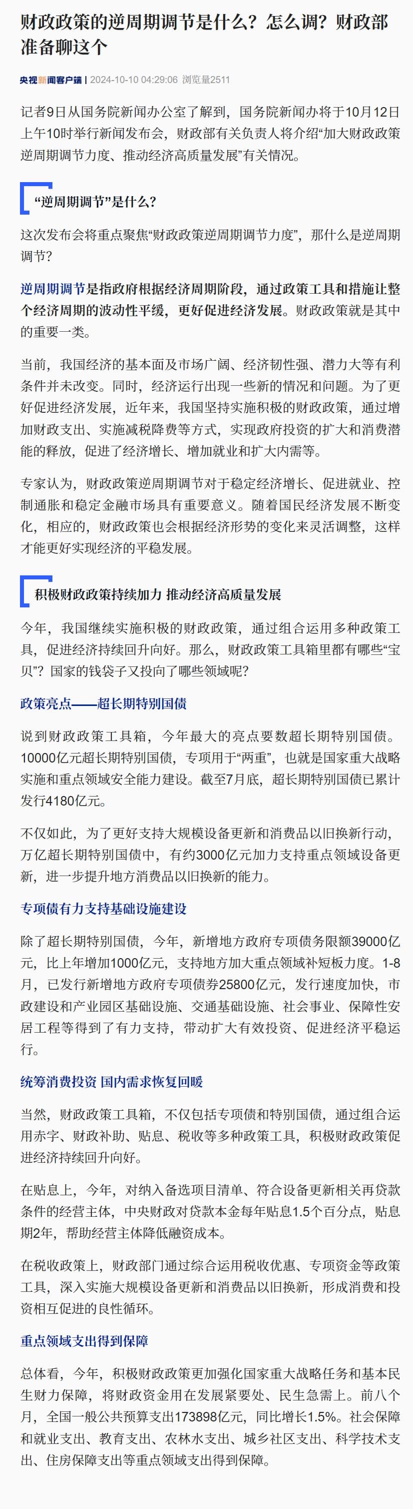 重要事件:中國財政部將於 10 月 12 日介紹加大財政政策逆週期調節力度等情況。