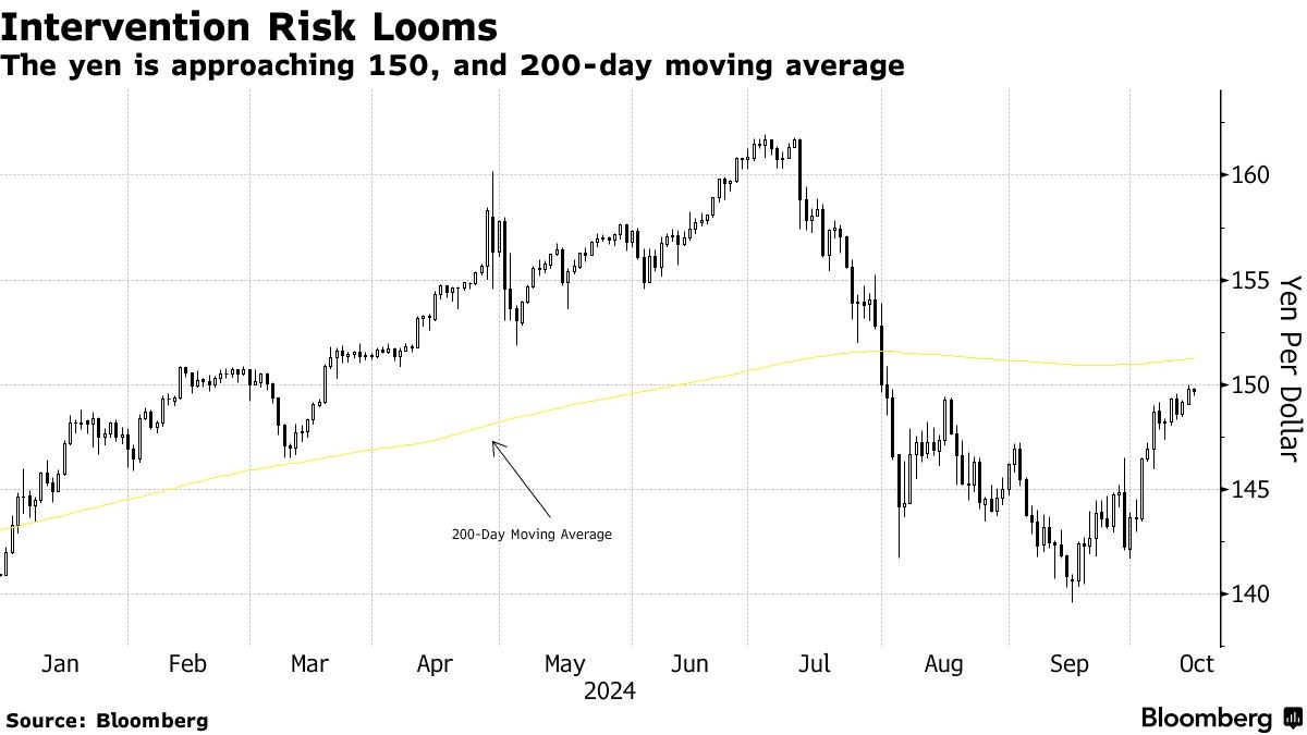 日元在連續兩週走軟後,週一一度跌至 1 美元兑 149.98 日元。數據顯示,日元兑美元匯率在截至 10 月 5 日的一週內下跌約 4.4%,為 2009 年 12 月以來的最大單週跌幅。日元進一步貶值的前景促使策略師警告稱,日本當局在 1 美元兑 150 日元附近 (200 日移動均線為 1 美元兑 151.25 日元) 干預的風險加大。