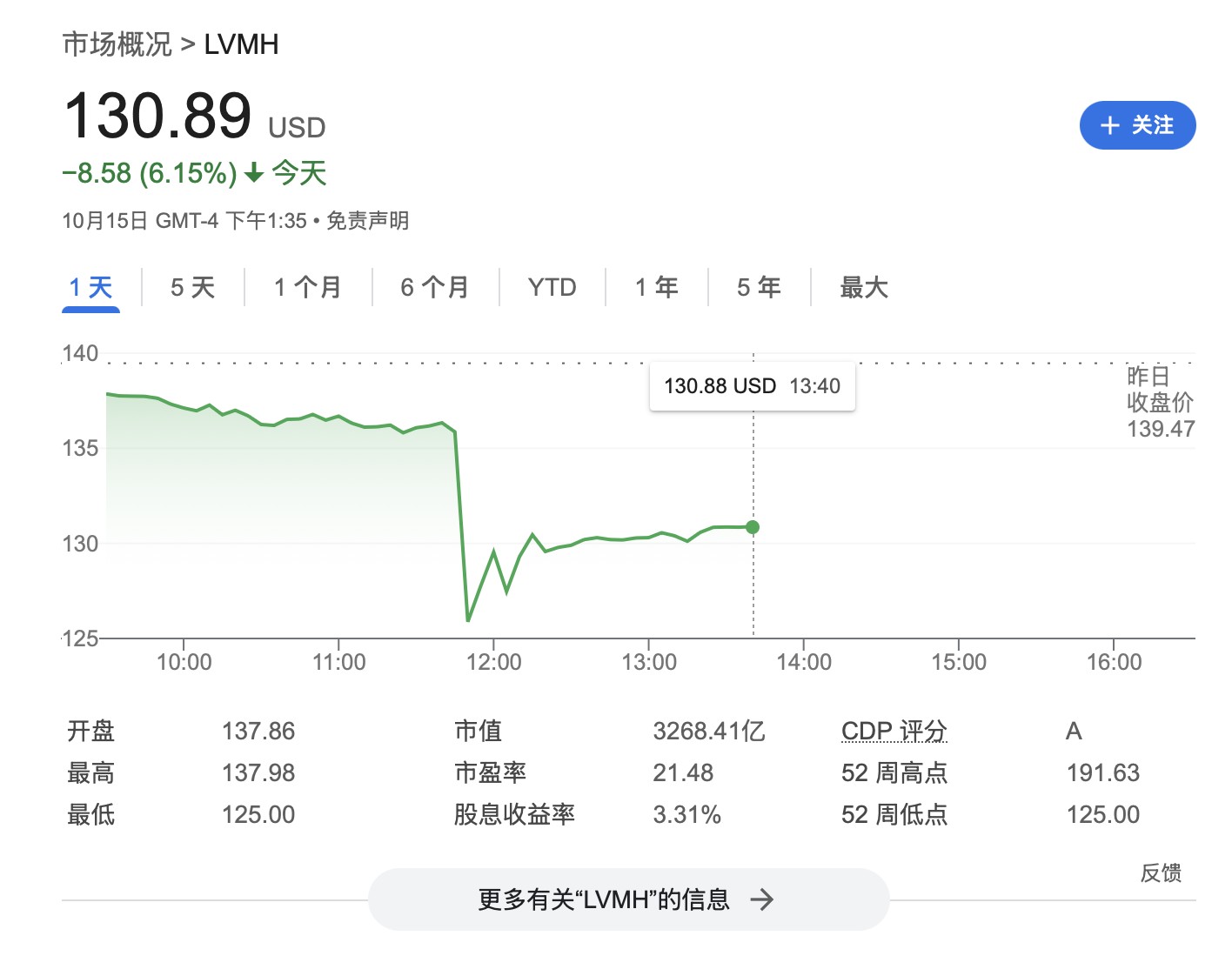 財報公佈後,LVMH 的美股 ADR 一度暴跌 10%,跌幅後收窄至 6% 左右。其他奢侈品股票,包括 Ralph Lauren 公司、雅詩蘭黛公司(Estee Lauder)、Gucci 母公司開雲集團(Kering SA)大幅下挫。