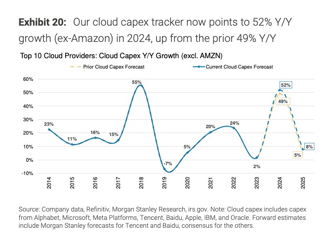 而摩根士丹利的雲資本支出追蹤指標現在顯示,2024 年該指標同比增長將達到 52%(不包括亞馬遜),高於之前預測的 49% 同比增長,預計 2024-2025 年間的雲資本支出將接近 3800 億美元,比過去三年的總和多出近 500 億美元。