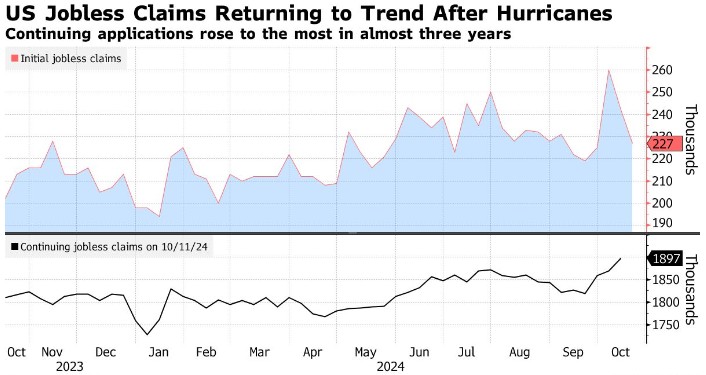 美國初請失業金人數連續第二週下降,降至颶風前水平,10 月 19 日當週減少 1.5 萬人至 22.7 萬人,低於經濟學家預測的 24.2 萬。儘管續請失業金人數增至近 190 萬人,為近三年來最高,整體就業情況略有改善。經濟學家指出,颶風影響消退較快,且波音罷工可能影響數據。市場對美聯儲降息的預期增強。