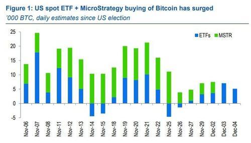 Kendrick 的報告稱,到 2025 年,渣打預計,機構資金流將繼續保持或超過 2024 年流入比特幣的速度。MicroStrategy 正在提前實現該公司 10 月末公佈的計劃,即未來三年籌集 420 億美元買入比特幣,因此,MicroStrategy 2025 年的購買量應該會達到或超過 2024 年的購買規模。