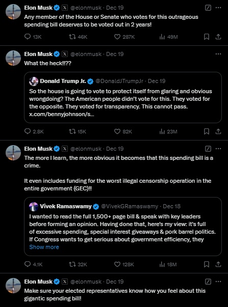 他譴責其為 “有史以來最糟糕的法案之一”,並威脅道,“任何投票支持這項離譜支出法案的眾議院或參議院議員都應該在兩年內被投票淘汰”,還在許多推文上配上了 “憤怒” 的表情符號。