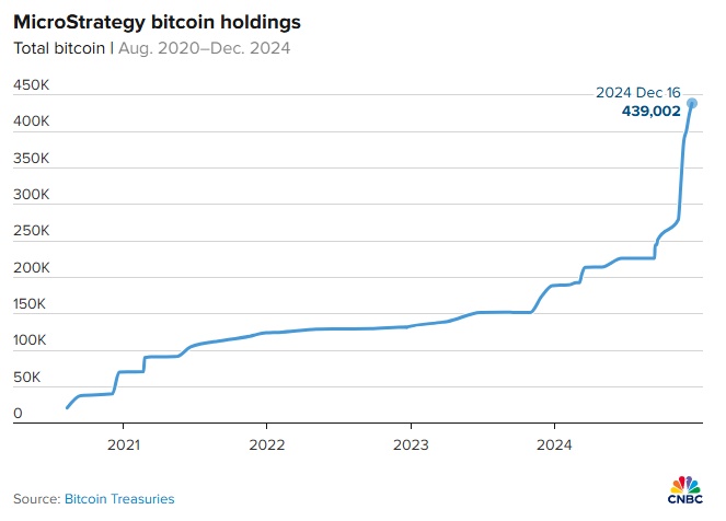 MicroStrategy 今年以來累計上漲近 500%,成為全球第四大比特幣持有者。該公司自 2020 年中以來已購買 43.9 萬枚比特幣,當前價值約 420 億美元。創始人 Michael Saylor 提議微軟應投資比特幣,但大多數股東反對。最近,MicroStrategy 以約 5.61 億美元購入 5,262 枚比特幣,總持有量達 444,262 枚。