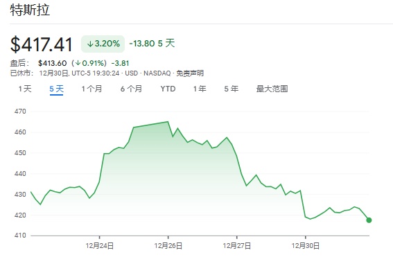 隔夜,特斯拉股價下跌 3.3% 至 417.41 美元,這是連續第三個交易日下跌,上週五特斯拉股價重挫近 5%。