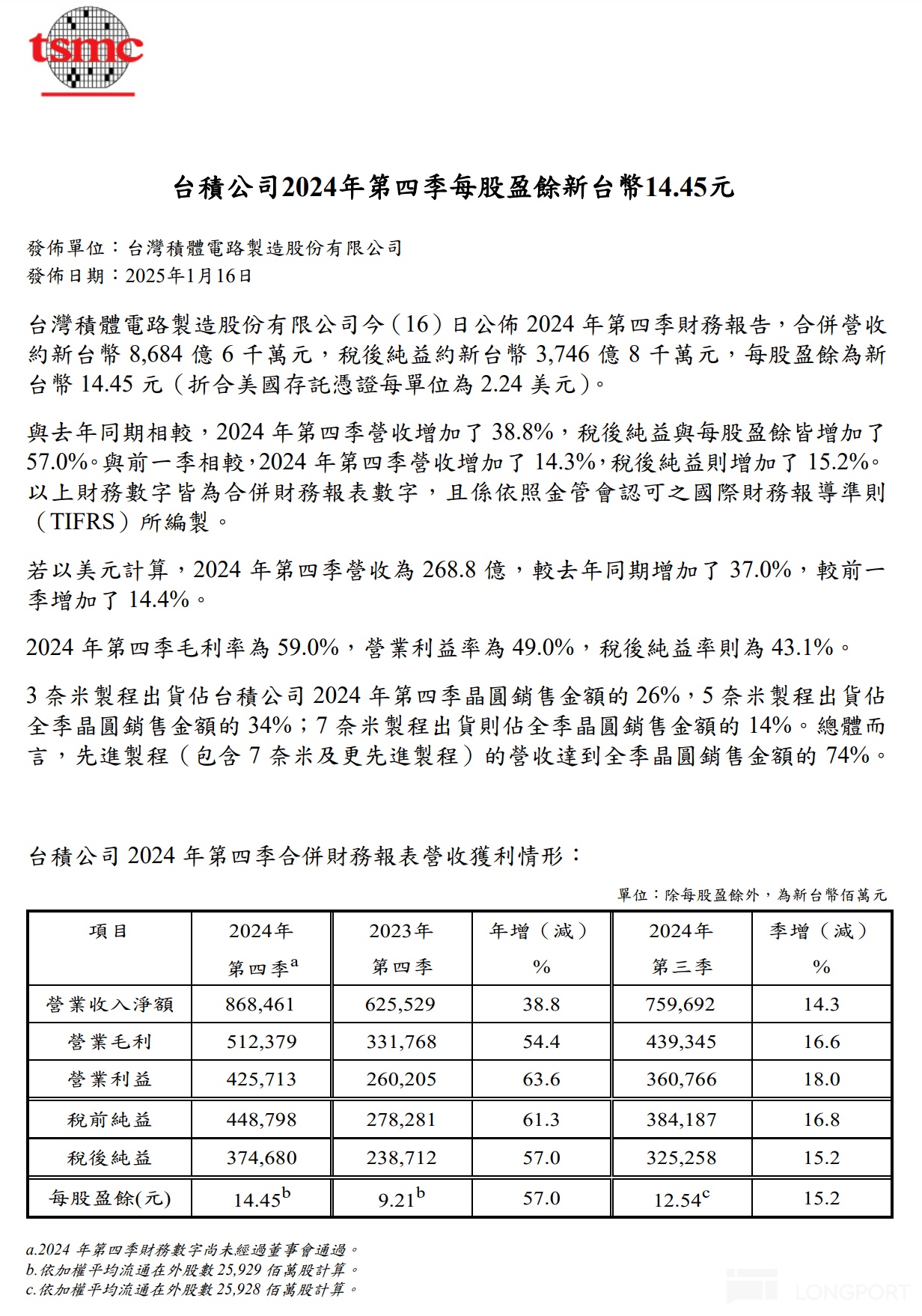 台灣積體電路製造股份有限公司今(16)日公佈 2024 年第四季財務報告,合併營收約新台幣 8,684 億 6 千萬元,税後純益約新台幣 3,746 億 8 千萬元,每股盈餘為新台幣 14.45 元(摺合美國存託憑證每單位為 2.24 美元)。