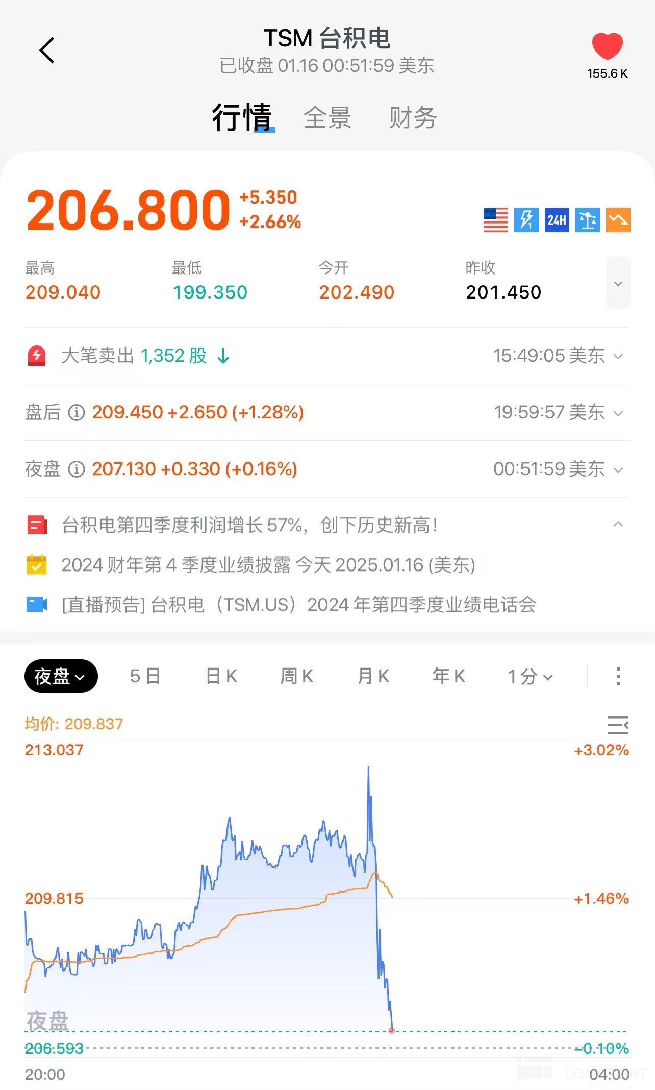 不過,台積電股價衝高回落,夜盤從一度漲近 3% 到接近 0%。電話會議即將舉行。