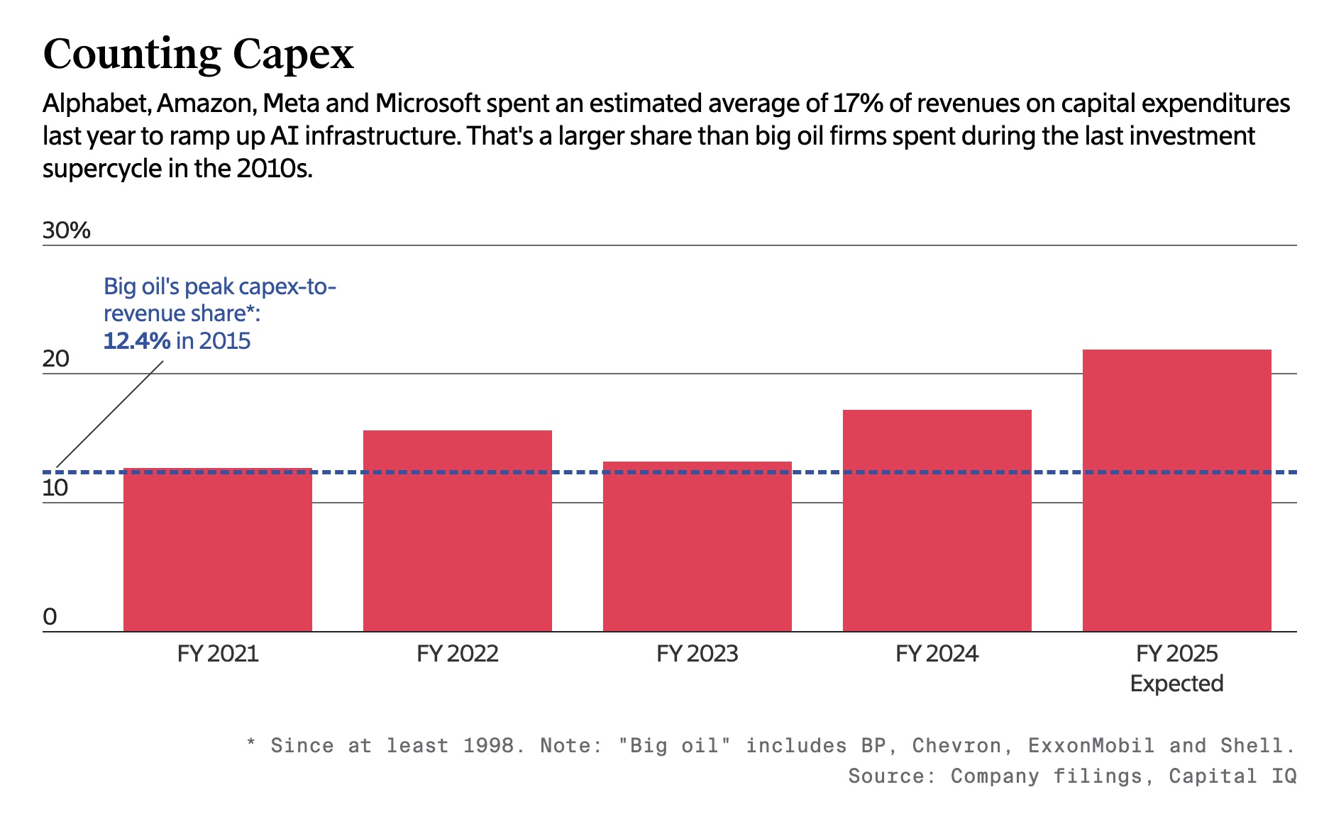媒體統計,這波 AI 投資熱潮資本密集程度超過上次石油熱潮,2024 年微軟、Meta、亞馬遜和 Alphabet 的資本支出平均佔其收入的 17.2%,高於 2021 年的 12.7%,預計 2025 年這一數字將進一步上升至 22%。