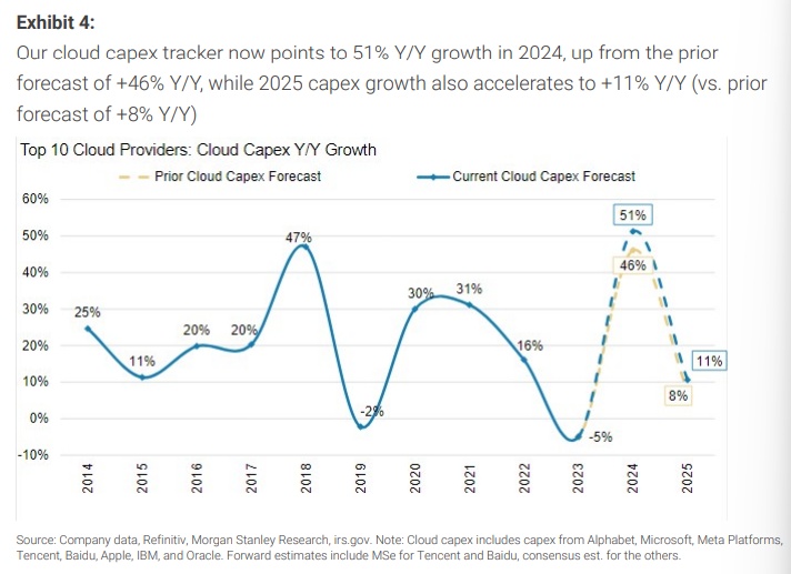 在上述研究報告中,大摩的大中華區半導體研究團隊對 2025 年前十大雲廠商資本開支增速的預期是同比 11%(此前是 8%)。