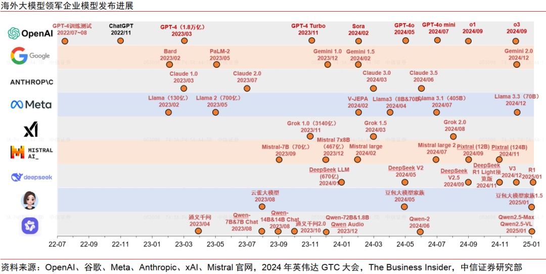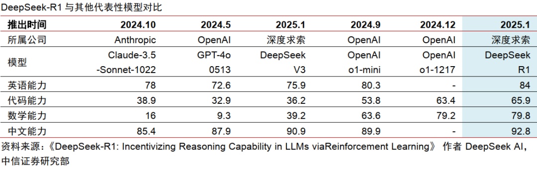 DeepSeek 在算力受限條件下,率先復現 GPT-o1,數學、代碼、自然語言的表現比肩 o1,獨立開源 RL-Scaling 技術。V3 版本通過 MoE、MLA 等創新架構,以及改變訓練策略,實現低成本高效訓練,據 DeepSeek-R1 文檔披露,其預訓練成本近不到 600 萬美元。R1 版本探索從監督微調 SFT 到零監督微調,通過 GRPO 和高效獎勵系統結合,在實現性能提升的同時顯著降低成本。DeepSeek 打破美國在 AI 競爭中的壟斷優勢,AI 平權將改變全球科技產業格局,亦點燃應用爆發的期待。