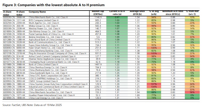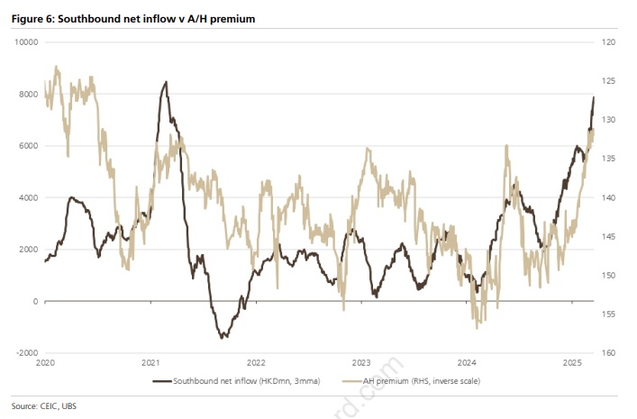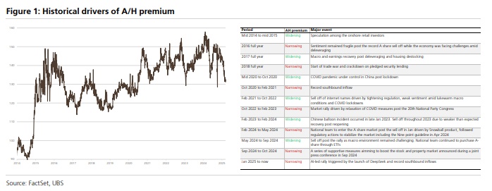 瑞銀稱,隨着 A/H 溢價接近歷史低點,境內共同基金在港股持倉處於歷史高位,加上宏觀經濟出現改善跡象,A/H 溢價可能會回升。