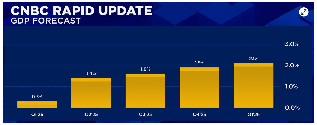 多數經濟學家平均預測經濟將逐步復甦:二季度 GDP 增速 1.4%、三季度 1.6%、四季度升至 2%。但危險在於 0.3% 的微弱增長極易滑向負值區間。隨着新關税本週落地,並非所有人都對反彈充滿信心。