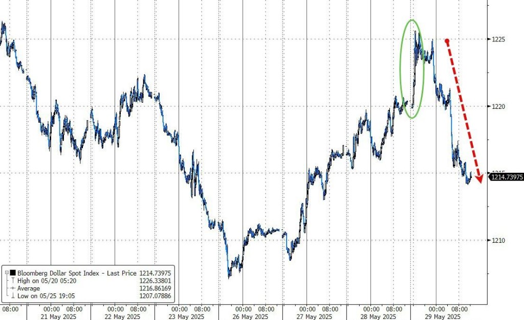 彭博美元指數跌 0.5%,刷新日低至 1214.11 點,07:44 也曾漲至 1225.58 點刷新日高。
