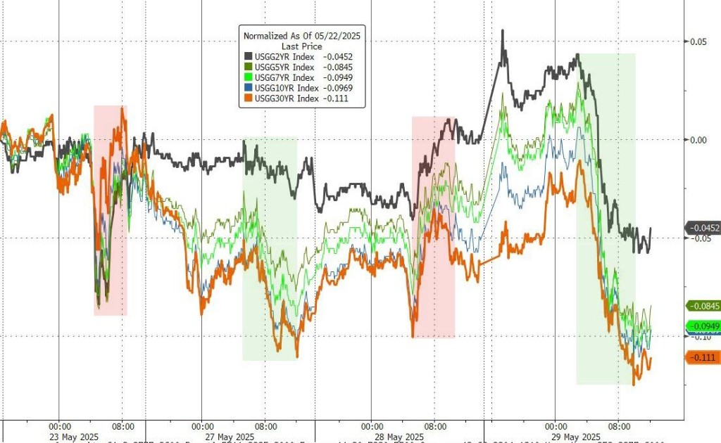 兩年期德債收益率跌 3.0 個基點,刷新日低至 1.767%,美國貿易法庭否決總統特朗普的關税政策之後 “跳空高開”;30 年期德債收益率跌 4.4 個基點,刷新日低至 2.987%。