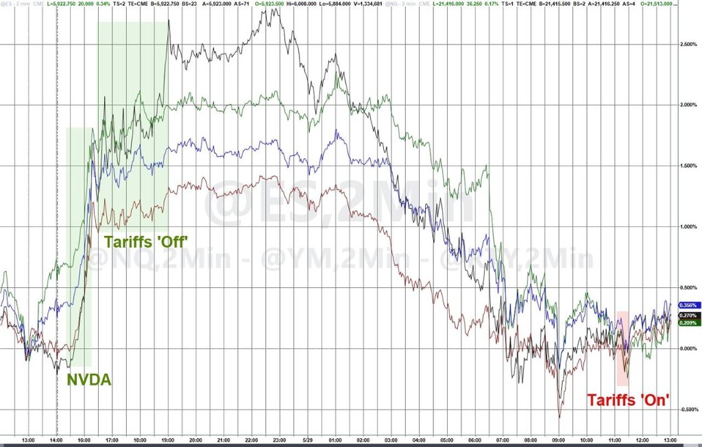 貿易政策混亂限制美股漲幅,標普指數盤中曾短線轉跌。科技七巨頭漲跌不一,英偉達一季度強勁財報支撐股價收漲。特朗普政府擬為關税裁決打到最高院,關税前景不明,投資者保持謹慎。美債收益率加速下行,美元指數衝高後轉跌,黃金、日元和瑞郎等避險品種走強。