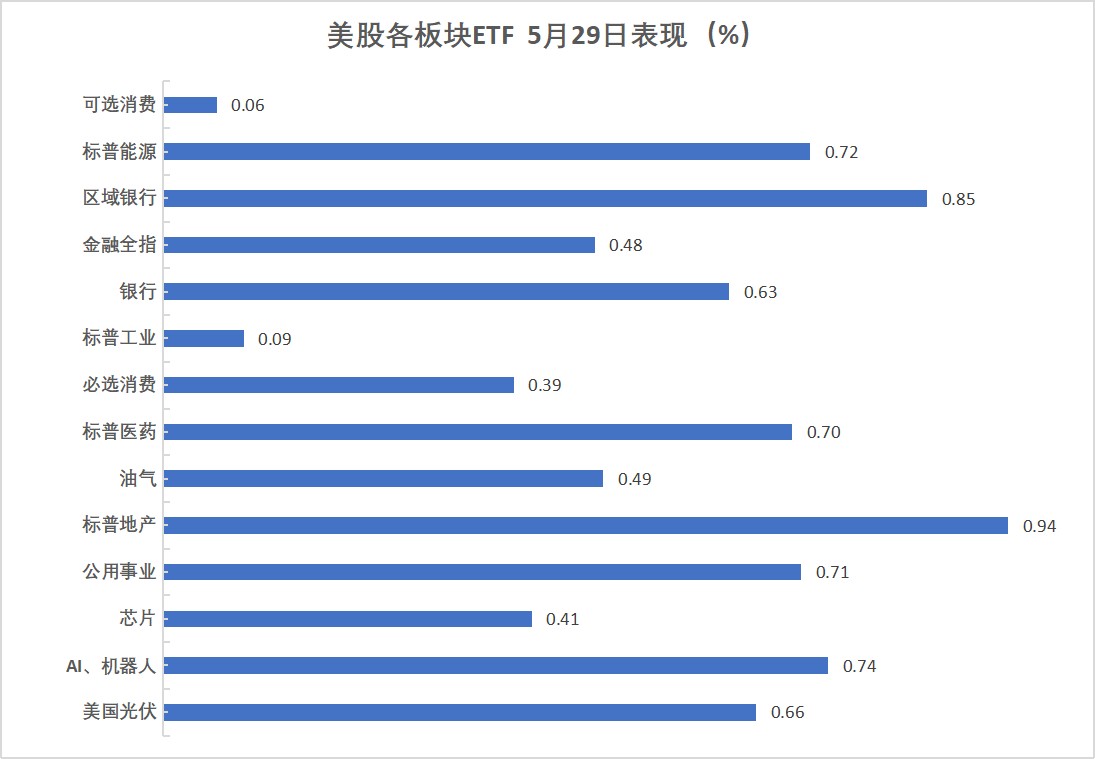 區域銀行收漲 0.85%,ai 機器人收漲 0.74%,標普能源收漲 0.72%。