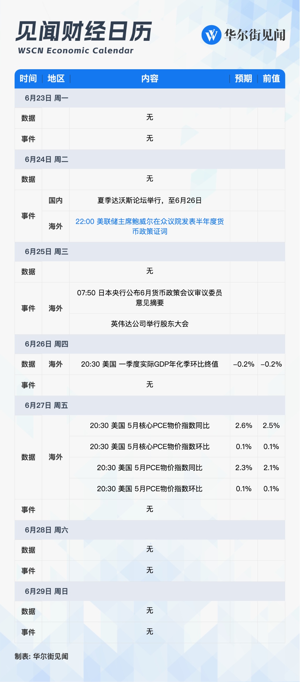 本週重點關注:2025 夏季達沃斯在天津開幕,鮑威爾半年度貨幣政策證詞、美國 5 月 PCE 物價指數,英偉達股東大會,美國、德國、英國、澳大利亞、日本等多國公佈 6 月 PMI。