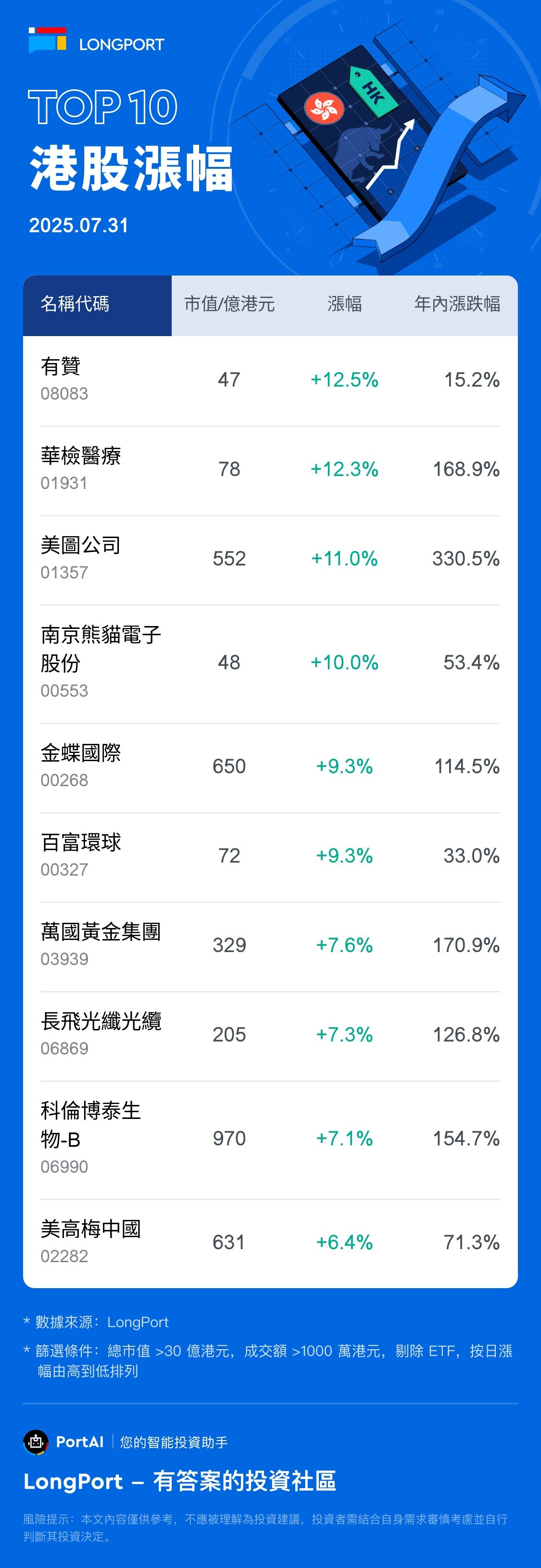 有贊 (08083) 涨 12.5%,成交额 1.3 亿港元,年内累计涨 15.2%。 華檢醫療 (01931) 涨 12.3%,成交额 2813.7 万港元,年内累计涨 168.9%。 美圖公司 (01357) 涨 11.03%,成交额 29.3 亿港元,年内累计涨 330.5%。