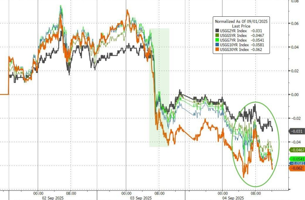 疲軟數據大幅提振投資者對美聯儲年內降息的押注。美債收益率全線下挫,10 年期跌 5.6 基點。中長期德債收益率跌約 2 個基點。