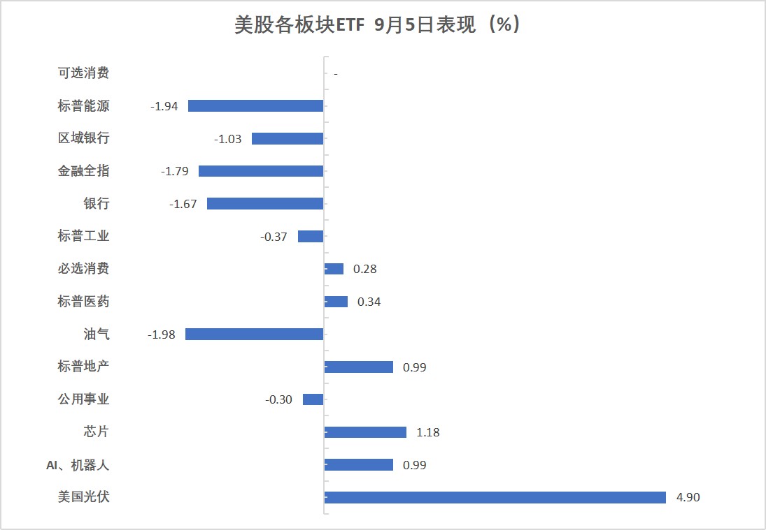 油氣板塊跌 1.98%,標普能源跌 1.94%,金融全指跌 1.79%,美國光伏板塊則漲 4.90%。