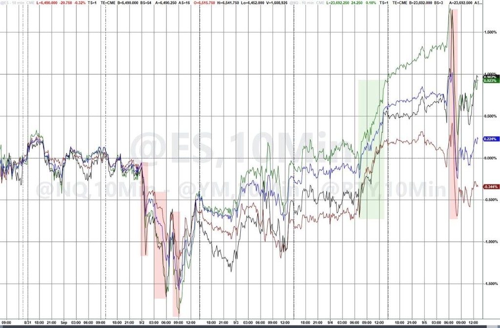 降息預期疊加避險需求,美債收益率全線下挫,10 年期跌逾 8 基點,2 年期跌至 2022 年以來最低。美元指數跌至 98 下方。加密貨幣衝高回落,以太坊一度較日高下挫 5.2%。黃金上漲、盤中刷新記錄高點至 3600 美元。美油跌至三個月來低點。