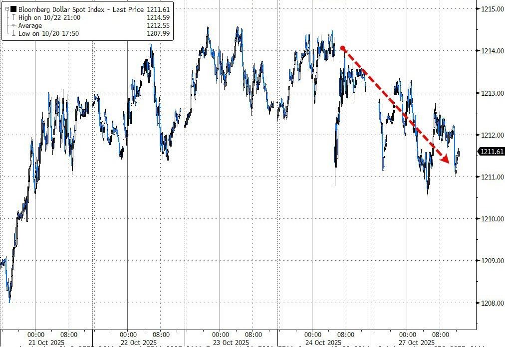 美元震盪走低 0.16%,離岸人民幣創兩個月最大升值幅度。阿根廷比索兑美元漲超 3%,米萊在阿根廷中期選舉中勝利。以太坊 24 小時一度漲 4.7%,隨後較日高跌約 3%。