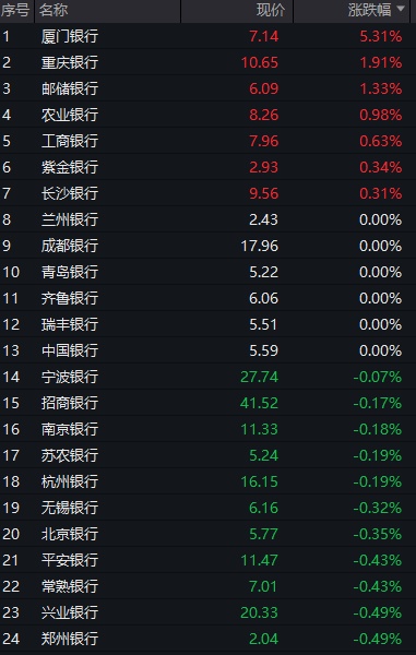 銀行股走勢分化,農業銀行漲超 1% 再創歷史新高,總市值逼近 3 萬億大關;郵儲銀行、工商銀行跟漲,浦發銀行跳水跌超 4%。