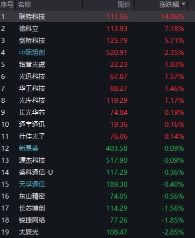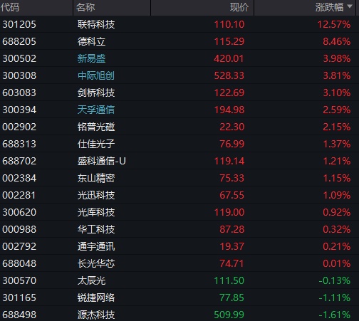 CPO 概念震盪回升,中際旭創漲近 4%,續創歷史新高,聯特科技漲超 10%,騰景科技、劍橋科技、德科立、光迅科技等跟漲。