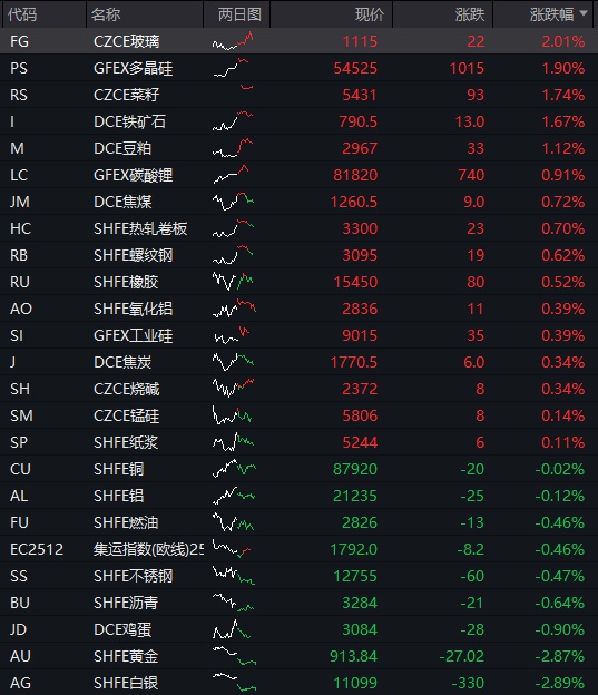 商品:國內商品期貨普漲,截至午盤收盤,玻璃漲 2%,多晶硅、菜籽、鐵礦石、豆粕漲超 1%,碳酸鋰、焦煤、熱卷板、螺紋鋼、橡膠、氧化鋁、工業硅、焦炭、燒鹼、錳硅、紙漿等走高,滬銅、滬鋁、燃油、集運指數、不鏽鋼、瀝青、雞蛋等下跌,受到國際黃金隔夜跌破 4000 美元關口,白銀大跌 5% 影響,滬金、滬銀均跌超 2%。