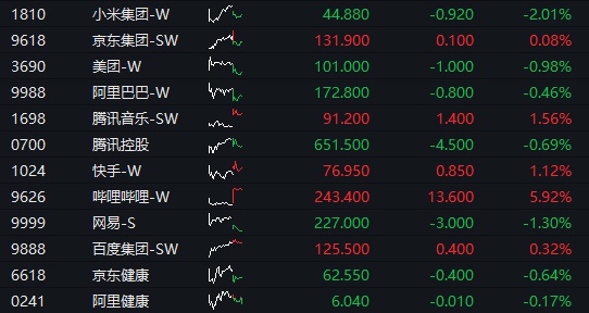 大型科網股分化,嗶哩嗶哩逆勢大漲近 6%,快手、騰訊音樂漲超 1%,百度、京東小幅上漲,阿里、騰訊控股等微跌,尤小米跌 2%。