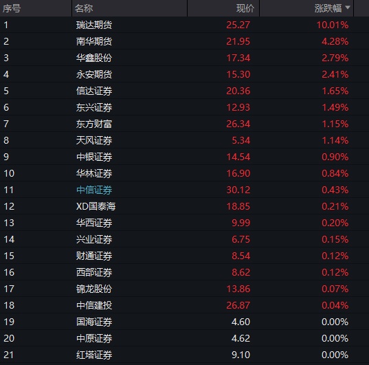 臨近午盤,大金融板塊異動拉昇,多元金融、互聯金融方向領漲,瑞達期貨直線漲停,天利科技漲超 10%,匯金股份、南華期貨、同花順、華鑫股份、東興證券等衝高。