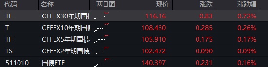 債市:國債期貨全線反彈,截至午盤收盤,30 年期主力合約漲 0.72%,10 年期主力合約漲 0.26%,5 年期主力合約漲 0.17%,2 年期主力合約漲 0.09%。