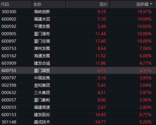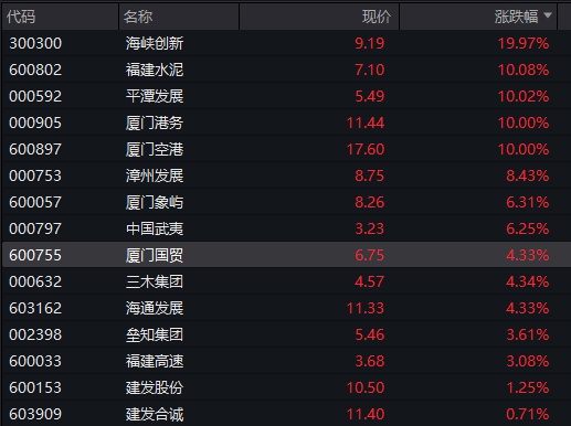 福建海西板塊再掀漲停潮,海峽創新兩連 20% 漲停,平潭發展 8 天 6 板,福建水泥、廈門港務、廈門空港集體封板,漳州發展、中國武夷衝擊漲停。