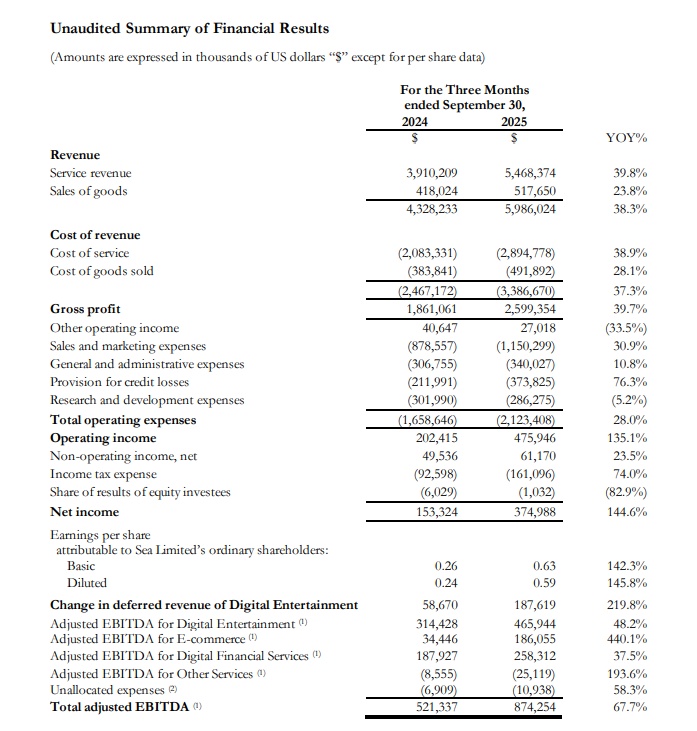 Sea 發佈業績,公司 Q3 營收 59.86 億美元,同比增長 38.3%,高於分析師預期的 56.5 億美元;毛利潤 25.99 億美元,同比增長 39.7%;淨利潤 3.75 億美元,同比增長 144.6%;公司 Q3 每股收益為 0.59 美元,同比增長 145.8%,低於分析師普遍預期的 0.77 美元。