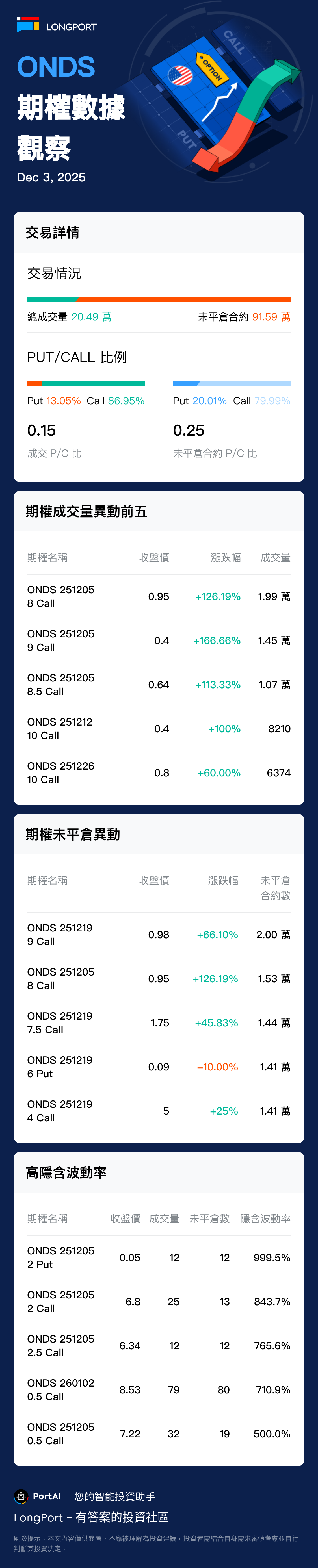 美東時間 2025-12-03,Ondas Holdings Inc.期權總成交 204864 張,看漲期權佔比 86%,看跌期權佔比 13%。
