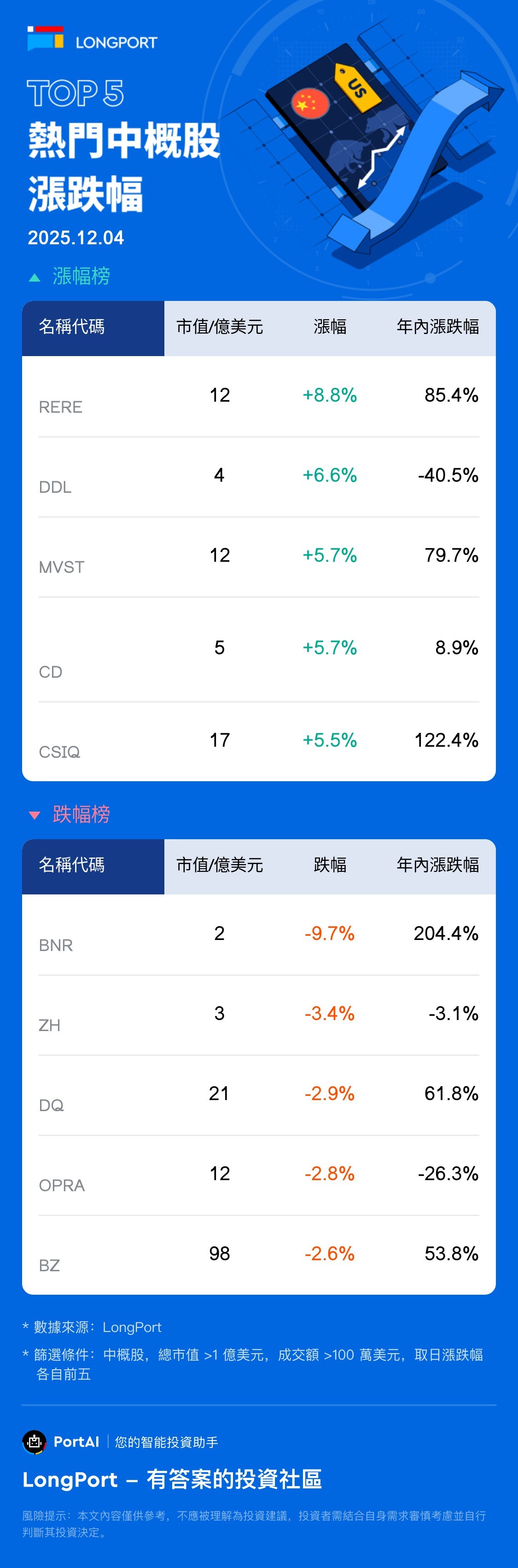 Top 10 熱門中概股漲跌幅(12月4日)