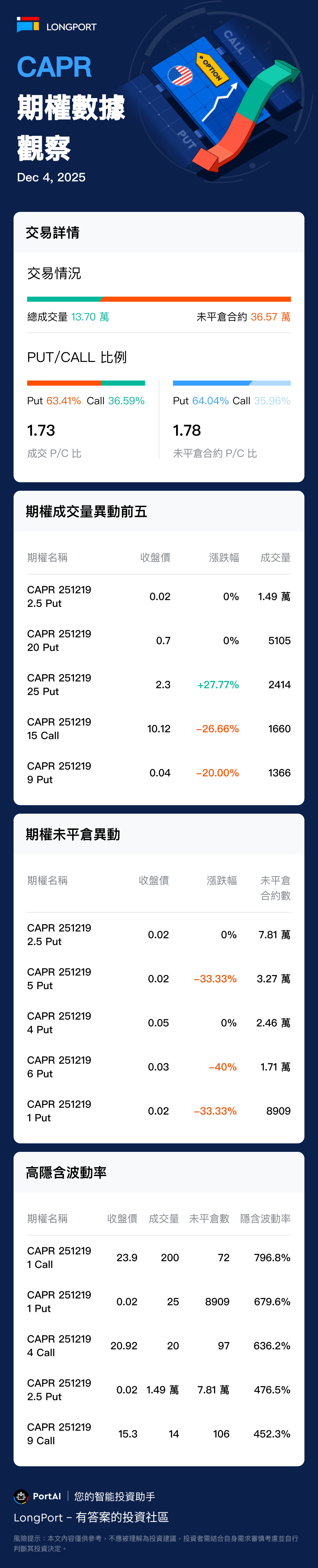 美東時間 2025-12-04,Capricor 治療期權總成交 136986 張,看漲期權佔比 36%,看跌期權佔比 63%。