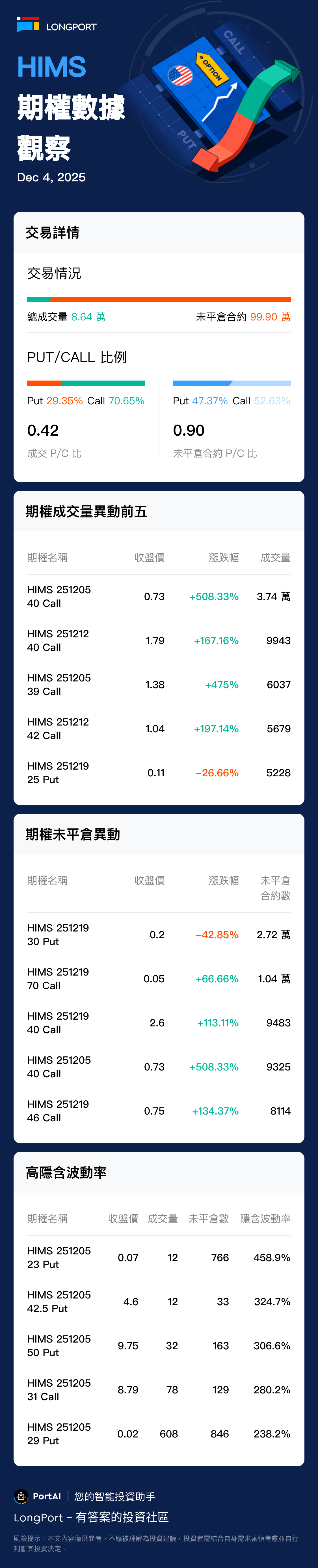 美東時間 2025-12-04,Hims & Hers Health, Inc.期權總成交 86385 張,看漲期權佔比 70%,看跌期權佔比 29%。