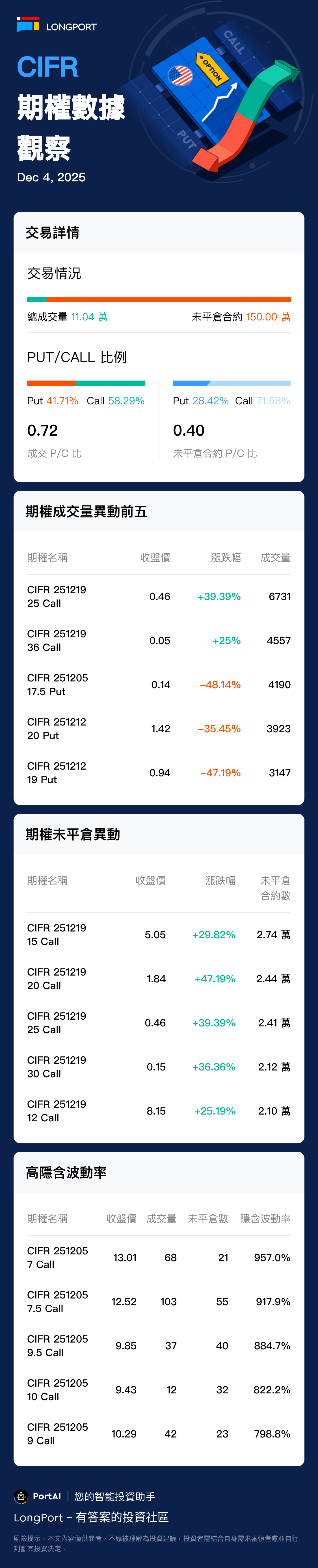 美東時間 2025-12-04,Cipher Mining Inc.期權總成交 110380 張,看漲期權佔比 58%,看跌期權佔比 41%。