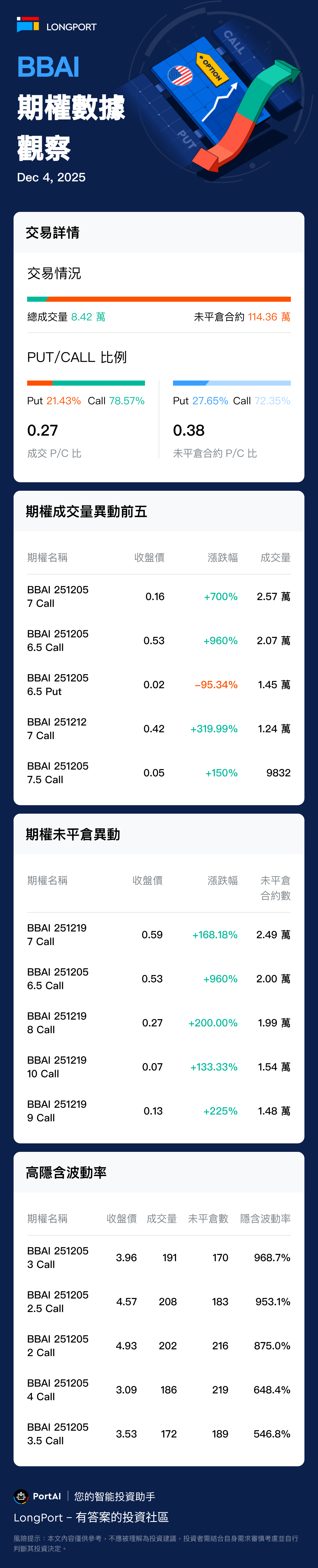美東時間 2025-12-04,BigBear.ai Holdings, Inc.期權總成交 84231 張,看漲期權佔比 78%,看跌期權佔比 21%。