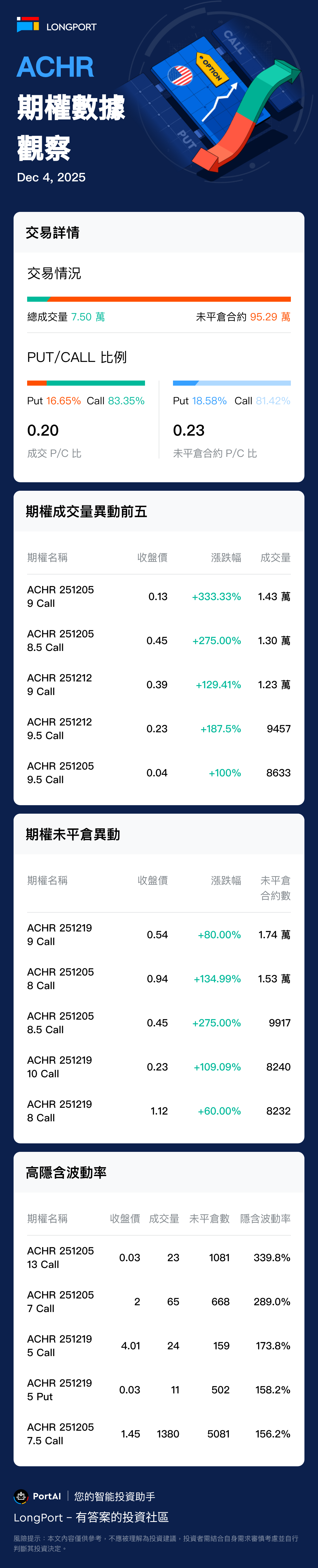 美東時間 2025-12-04,Archer Aviation Inc.期權總成交 75046 張,看漲期權佔比 83%,看跌期權佔比 16%。
