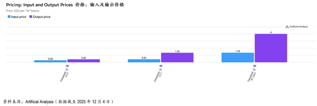 降幅對比:相比 2025 年 9 月發佈的 V3.1Reasoning(輸入 0.42/輸出 1.34 美元),輸出成本暴跌 69%,輸入成本降低 33%。相比 2025 年 1 月的 R1 模型,價格優勢更加呈指數級擴大。
